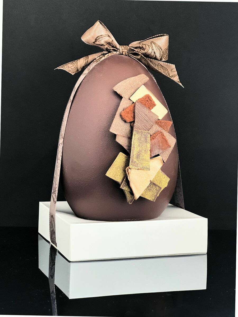 Chaque pièce est réalisée de façon 100 % artisanale en chocolat noir (64% de cacao) ou lait (36% de cacao). Tous nos œufs, grands et moyens formats, sont garnis de friture maison en chocolat noir, lait, blanc et caramel.