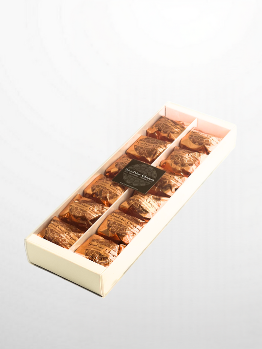 Ingredients (full list and variable depending on the composition of the boxes): cocoa, cream, butter, glucose syrup, invert sugar, dextrose, dried or nuts (almond, hazelnut, walnuts, sesame, peanuts), spices (Espelette pepper, cinnamon, ginger, pepper, liquorice, vanilla), fruit (pineapple, banana, raspberry, coco, sudachi, lemon, strawberry, calamansi, passion fruit), lavender, basil, honey, coffee, salt, alcohol (Green Chartreuse liqueur, Rum, Grand Marnier, Whisky), chestnut paste, milk powder, soy lecithin.