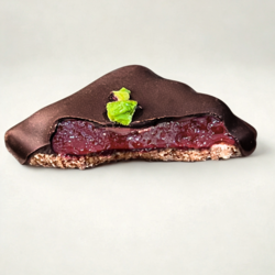 Biscuits craquants chapeautés d'un onctueux confit de framboise, de mangue / passion et de cassis, enrobés de chocolat noir 64% de cacao.